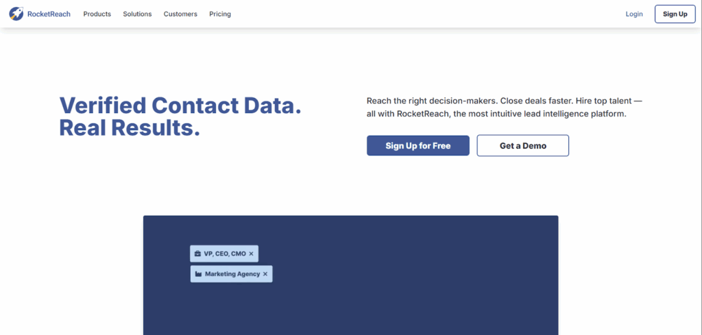 RocketReach has a large B2B database, enabling quick contact discovery with minimal setup. It also supports LinkedIn prospecting through a Chrome extension that allows users to find leads via email address or phone number.